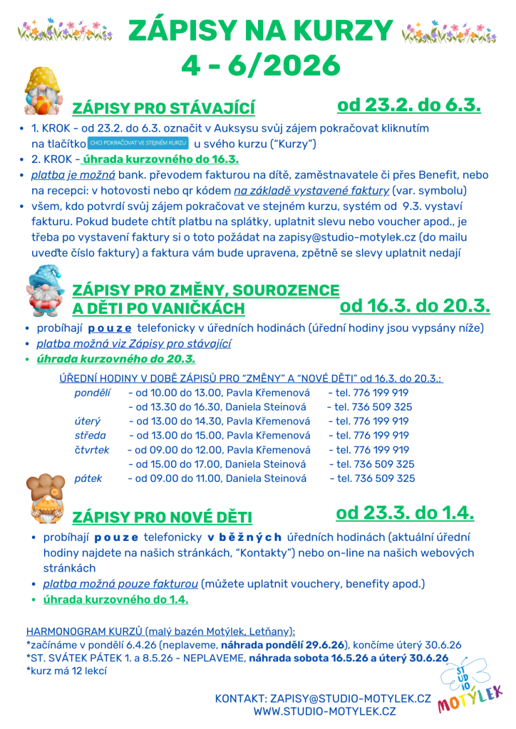 | děti 4 – 8 měsíců, od 2 do 3 let | 45′ | 3.380,- Kč (cena lekce v kurzu 260,- Kč) |
